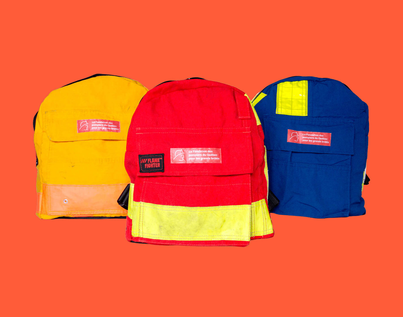 Sac à dos fabriqué en tissu recyclé d’habits de combat de pompiers. Entièrement produit au Québec, pratique, résistant, muni de bandes réfléchissantes.